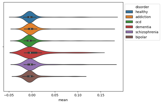 We visualize the distribution of the mean EEG signal for each disorder using a violin plot.