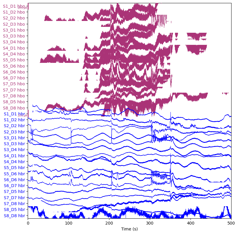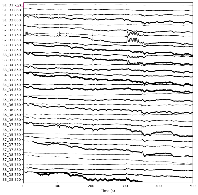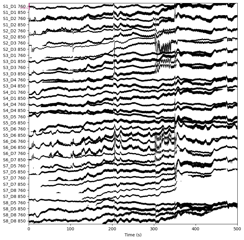 raw_haemo.plot(n_channels=len(raw_haemo.ch_names), duration=500, show_scrollbars=False)