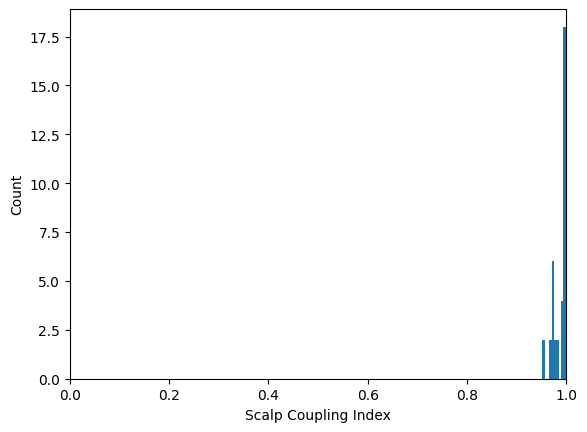 ax.set(xlabel="Scalp Coupling Index", ylabel="Count", xlim=[0, 1])